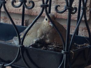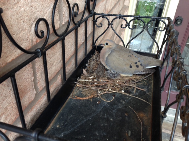 Well, the birds, as you can see by the pictures have been busy too. My front door is the busiest on the street with clients coming and going. Mama and Papa mourning doves decided that my porch would be the perfect place for their little darlings.
